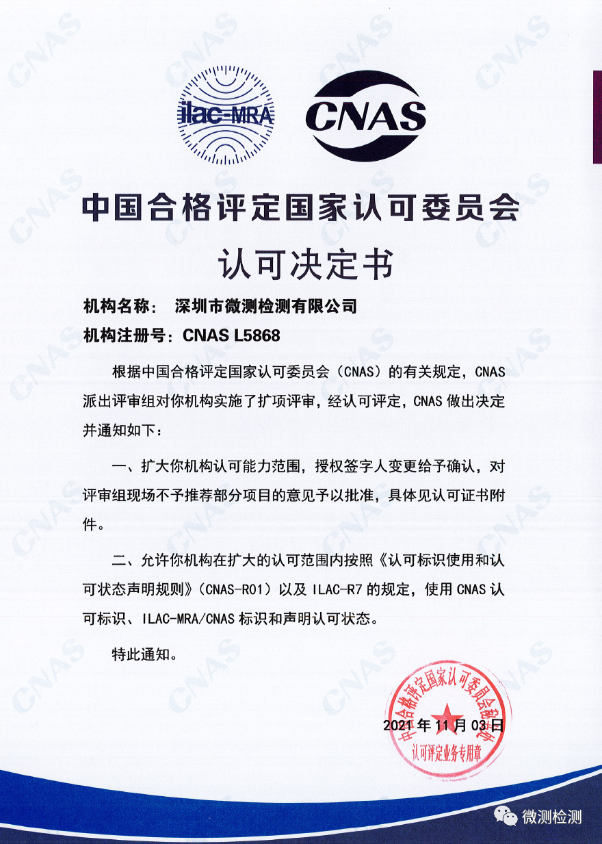 喜訊!微測(cè)檢測(cè)順利通過(guò)CNAS擴(kuò)項(xiàng)評(píng)審,并于2021年11月初收到了中國(guó)合格評(píng)定國(guó)家認(rèn)可委員會(huì)(以下簡(jiǎn)稱“CNAS”)擴(kuò)項(xiàng)認(rèn)可決定書。