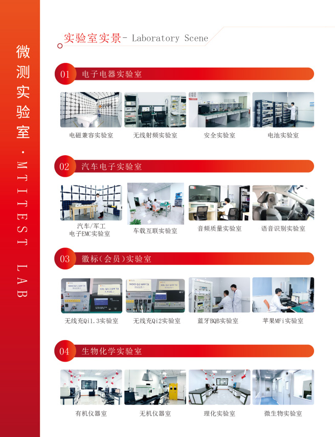 公司擁有20余個專業實驗室,128人的工程師團隊,10000㎡檢測科技園,獲得了CNAS、CMA、A2LA、CBTL、WPC、Bluetooth SIG等授權和認可。公司可為企業提供全球上百個國家的測試,包括華為HiCar、無線充Qi、藍牙BQB、蘋果MFi等眾多服務。無論企業身處何地,無論產品類型如何,微測檢測都能提供一站式解決方案,幫助企業順利進入全球市場。